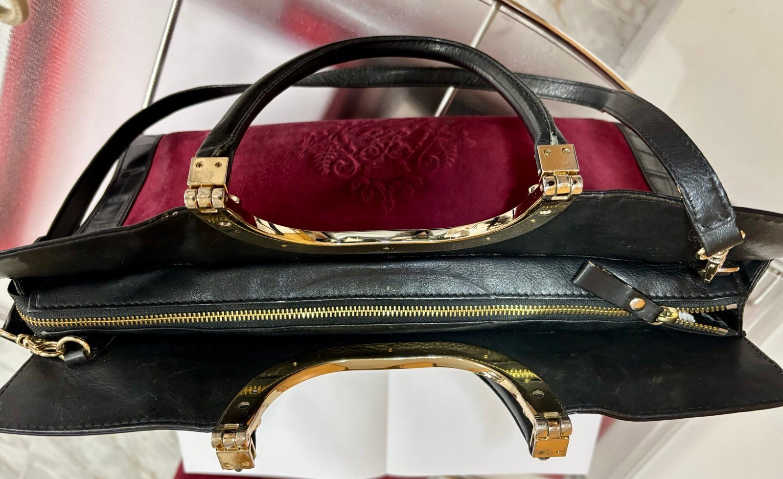 Piel negra y ante en morado. Tiene cierre de cremallera y asas plateadas. Tira de hombro opcional. Muy buen estado.